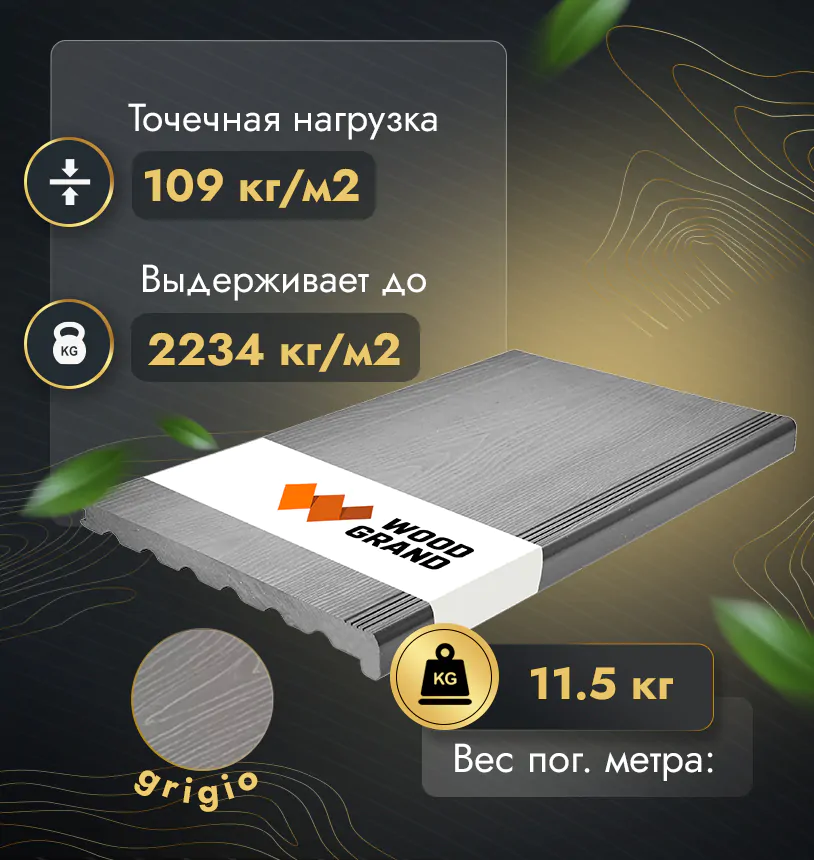 Наша террасная доска из МПК выдерживает до 3318 кг/м2, влагостойкая, не требует ухода.